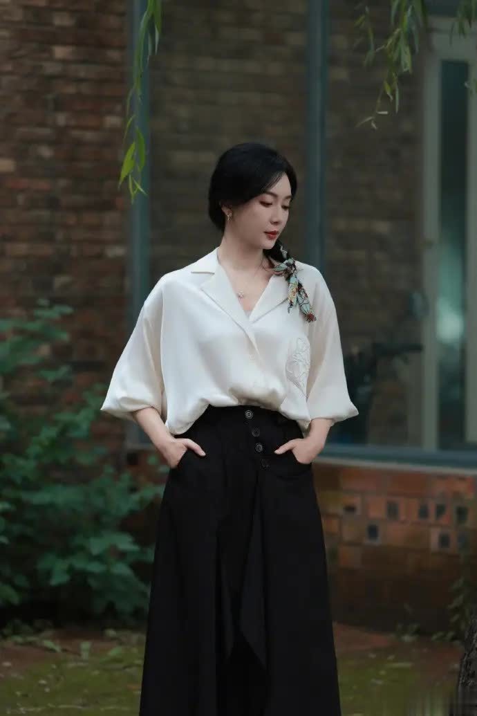 陈数的这套搭配,核心就是把最基础的黑白配色玩出了层次感,米白色缎面衬衫自带柔光滤镜,翻领设计利落大方,宽松落肩的版型弱化了肩线的硬朗感,七分袖刚好露出纤细的手腕,没有过度紧绷的刻意,反而透着慵懒松弛的气质。衬衫下摆随意塞进裤腰,打造出高腰线,轻松优化了身材比例,让整个人看起来挺拔又轻盈。